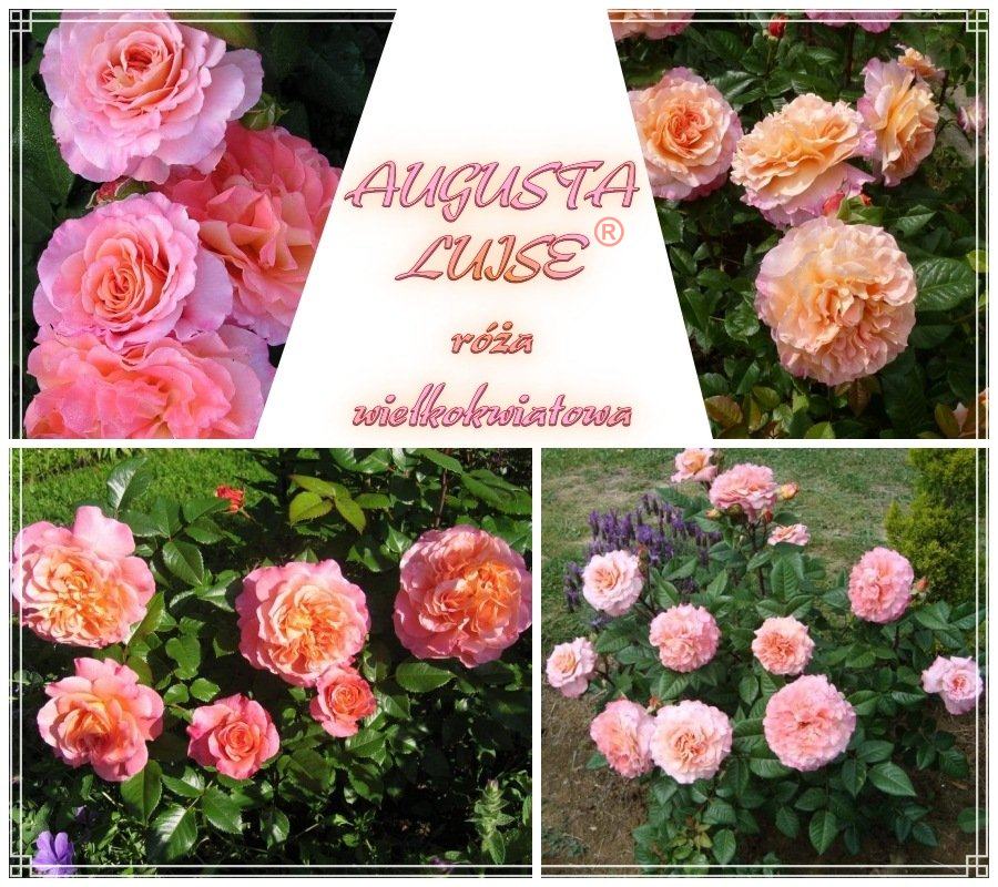 Jedna z kultowych róż nostalgicznych grupy Tantau. Odmiana nazwana została na cześć hrabiny Augusty Louise. Krzew wyglądem przypomina róże historyczne. Pełne, nostalgiczne, duże kwiaty ( 10 -12 cm ) o niebywałej barwie. Zmienia swoje pastelowe zabarwienie w zależności od warunków atmosferycznych i fazy kwitnienia od różu w odcienie moreli, żółci oraz czerwieni niczym taktowna księżniczka. Płatki falowane ( do 50 sztuk ) ścisło nakładają się na kwiat. Augusta Luise jest mocno pachnącą różą wielkokwiatową o owocowym aromacie. Odmiana osiąga około 100 cm wysokości i około 70 cm szerokości. Kwiaty zwykle osadzone pojedyńczo. Pędy długie, sztywne, proste, niezbyt kolczaste. Liście połyskujące, skórzaste, gęsto rozmieszczone na pędach. Krzaki dobrze rozkrzewiające się, gęste, wzniesione pędy. Kwitnie wystawnie, świetnie reguje na usuwanie przekwitłych kwiatostanów. Obficie i kilkakrotnie powtarza kwitnienie do pierwszych przymrozków. Przeciętna odporność na choroby grzybowe. Zalecany kopiec na zimę.