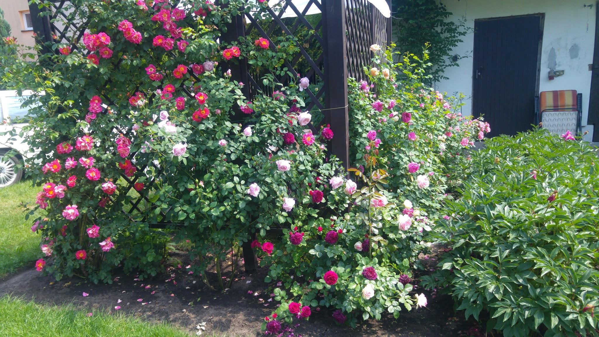 Obsadziliśmy pnącymi różami taras i dużą pergolę, gdzie rosną m.in. Rosarium Uetersen, Mrs John Laing, Laguna,