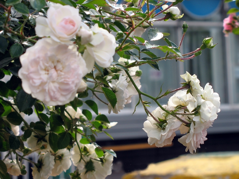 Kwiaty: Duże, pełne, białe kwiaty z lekkim różowym odcieniem.
