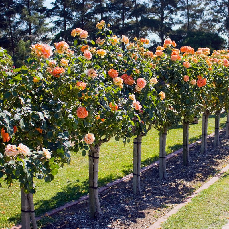 O wyborze i kompozycji róż piennych decydujemy zgodnie z naszymi upodobaniami. Jeśli chodzi o kształt korony róży piennej mamy zasadniczy podział na róże płaczące- tzn. kaskadowe oraz korony róż kopułowych. Róże kaskadowe nadają miejscu bardziej romantyczny, nostalgiczny charakter. Doskonale wyglądają jako solitery i ukształtowane kilkuletnie okazy przyciągają nasz wzrok. Odmiany kopułowe to doskonała klasyczna elegancja w ogrodzie.