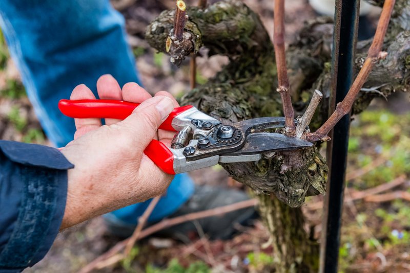 Winorośle: Przycinaj pędy jednoroczne, pozostawiając jedynie te, które będą owocować w nadchodzącym sezonie. Zredukuj liczbę pędów, aby winorośl była lepiej oświetlona.