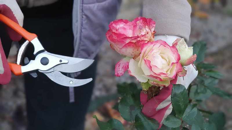Wiosną u wszystkich grup róż wykonuję cięcie sanitarne: usuwam wtedy pędy chore, uszkodzone oraz przemarznięte. Oprócz cięcia sanitarnego przeprowadzam również cięcie  formujące, które u różnych grup wygląda troszkę inaczej: u róż pnących i parkowych co roku wycinam najstarszy zdrewniały pęd, a ponieważ kwitną na 2- letnich pędach, tnę je od góry, 0,5 – 1 cm nad oczkiem zewnętrznym, lekko ukośnie.
