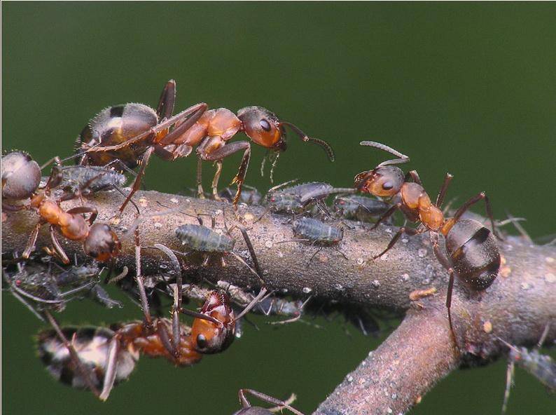 • mrówki powodują też jednak wzrost populacji niektórych szkodników, szczególnie mszyc. Mszyce naturalnie wytwarzają cukier w postaci tzw. spadzi, którą kochają jeść mrówki. Mrówki hodują więc mszyce, podobnie jak ludzie hodują krowy. Chronią je, aby te dawały im spadź;