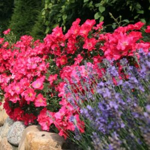 The Fairy w duecie z lawendą tworzy romantyczną, pachnącą rabatę, idealną przy tarasie czy wejściu do domu.