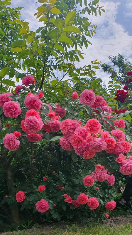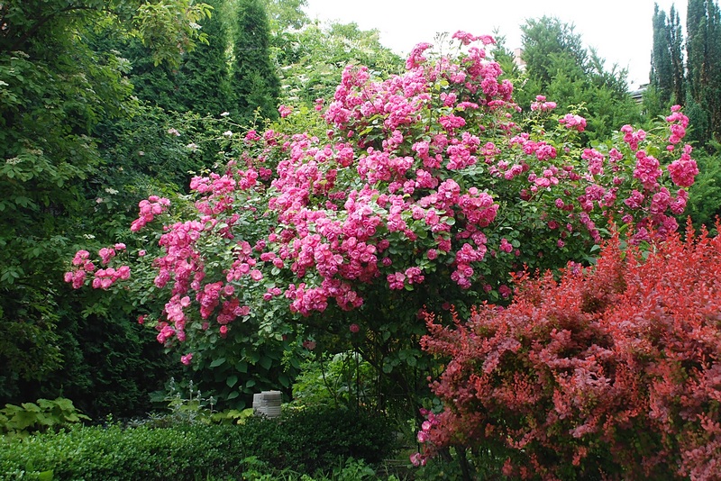 szpaler z róż parkowych i pnących w ogrodzie wiejskim: od lewej odmiany: Robusta, Gizelka, Westerland