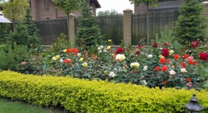 – Róże rabatowe w różnych odmianach i kolorach – mogą być zestawione kontrastowo lub ton w ton.