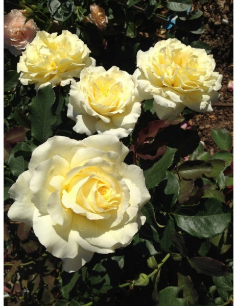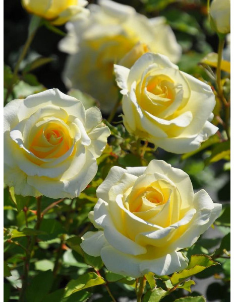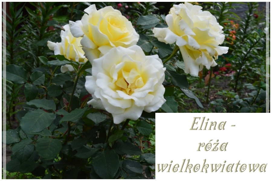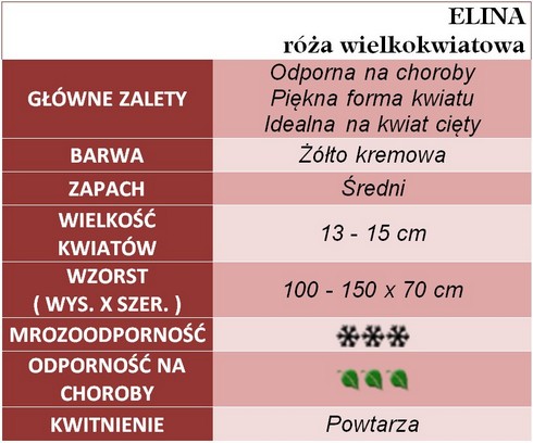 Tylko najlepsze odmiany róż wielkokwiatowych mogą zrównać się w rozmiarach i pięknie Eliny. Ale nie tylko. Ta odmiana dobrze znosi niesprzyjające letnie warunki: czy upał, czy zimno i wilgotno kwiaty zawsze zostają czystymi i świeżymi. Grube, naostrzone pączki już obiecują, że będziemy zachwycać się ogromnymi kwiatami. Mają klasyczną formę z elegancko odgiętymi płatkami i pojawiają się zawsze samotnie na długich pędach. Kiedy kwitnie - jaśnieje z daleka. Lekko pachnie. Idealne na kwiat cięty do wazonu. W centrum kwiatu zabarwienie zawsze najintensywniejsze. Kwitnięcie trwa do końca sezonu. Zmienia się ono zależnie od pogody i klimatu. W rodzinnej Wielkiej Brytanii i w warunkach Polski kwiaty cytrynowo - żółte, po brzegach wypalają się do kremowych. W gorętszych regionach one zazwyczaj kremowe albo czysto – białe a krzew rośnie nawet do 3 metrów. Krzaki odpowiadają kwiatom: wysokie i potężne, z mnóstwem potężnych bocznych pędów, rosnących z podstawy. W naszych warunkach w sprzyjających warunkach pod koniec lata spokojnie osiągną 1,5 m przy szerokości od 70 cm do 1 m. Liście pasujące do całości: duże, ciemne, błyszczące. Róża bardzo szlachetna, elegancka i nie kapryśna. Nie wymagająca troski względem obejścia. Odporna na zachorowania i bardzo dobra mrozoodporność potwierdzona certyfikatem ADR.