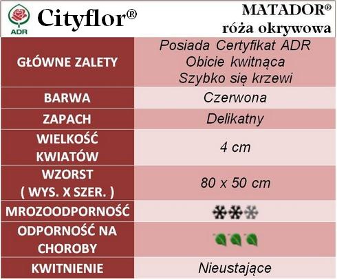 Wyjątkowa odmiana zaliczana do grupy okrywowej, ale także do grupy parkowej. Mocna czerwień świetnie kontrastuje z żółtym maleńkim pylnikiem. Około 16 sztuk pofalowanych, luźno ułożonych płatków tworzy zdumiewający 4 cm półpełny kwiat. Kwitnie w dużych kwiatostanach, nieprzerwanie aż do mrozów. Aromat jest słabo wyczuwalny. Krzew samoczyszczący, dzięki czemu nie potrzeba usuwać przekwitłych kwiatostanów. Odmiana, której kolor nie blednie od słońca. Mocno błyszczące, skórzaste, ciemnozielone listki bardzo gęsto ułożone na pędach. Pokrój krzaczka płożący, ponadto krzewiasty. Róża okrywowa Matador posiada niezbyt długie, pochylone pod ciężarem swych kwiatów pędy. Roślina silnie krzewiąca, dorasta do 80 cm wysokości osiągając szerokość 50 cm. Świetna odporność na wszelakie choroby grzybowe, warunki atmosferyczne, co potwierdza uzyskany certyfikat ADR. Na zimę zalecane kopczykowanie.