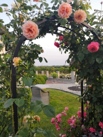 Pierwsze skrzypce grają róże pnące, a za nimi dywan angielskich róż