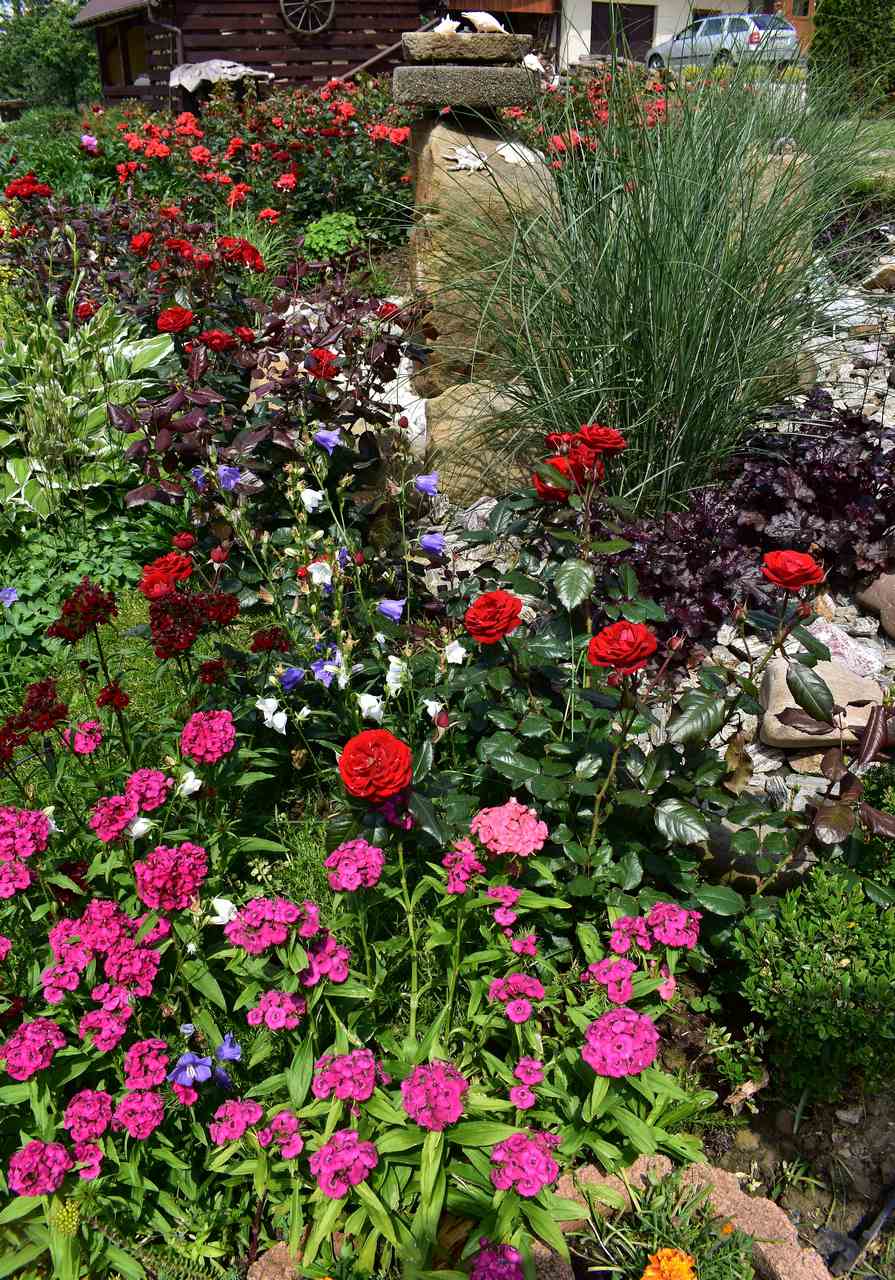 Pierwszy – zakątek różany na skalniaku z wykorzystaniem róż rabatowych o nazwie “Nina”, róże wkomponowane w trawy, niskie krzewy ozdobne, kamienie.