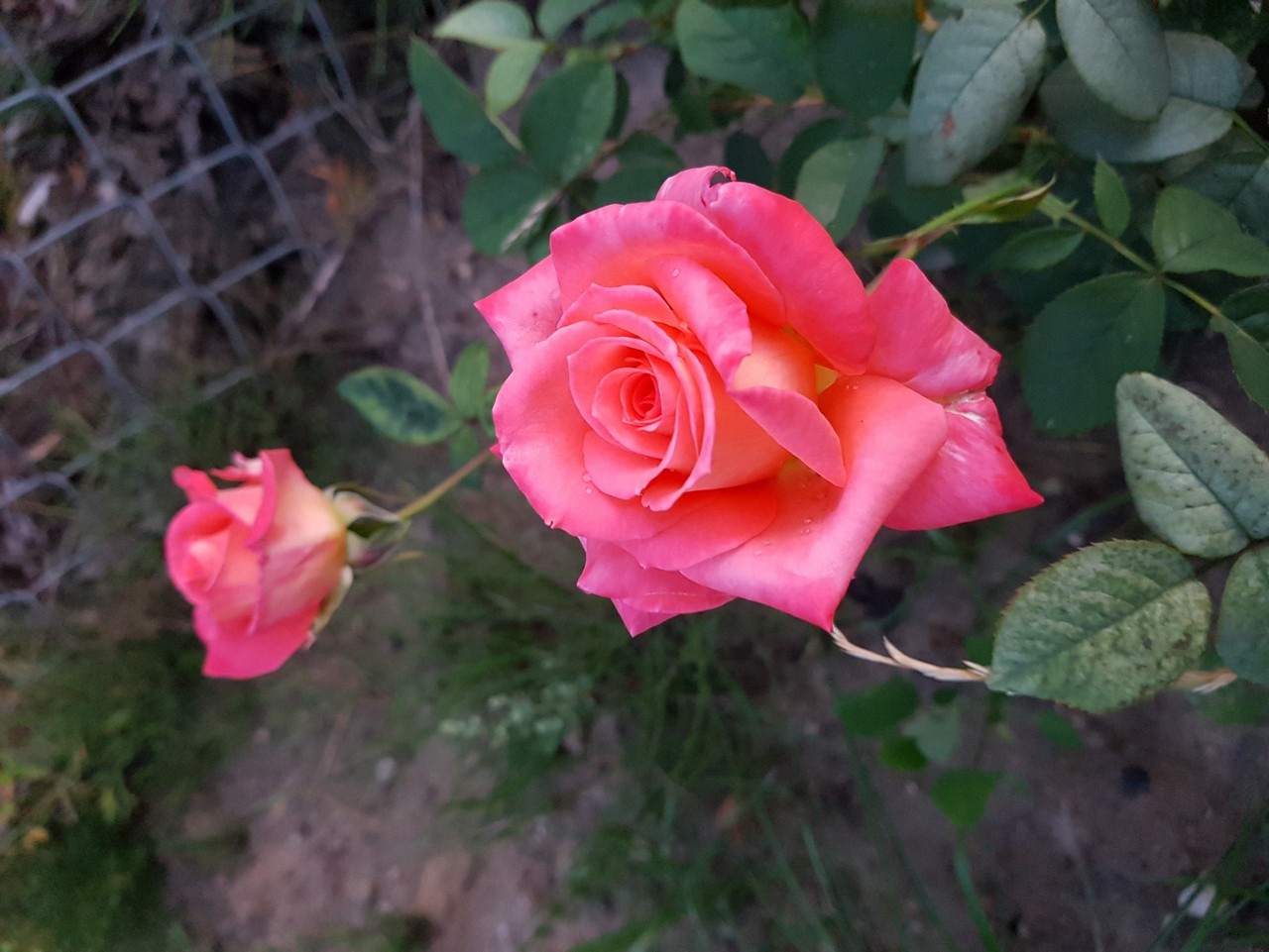 Róża „zdobyczna”?, to znaczy prezent od sąsiadki, która układając kostkę na podwórku chciała ją wyrzucić (jesień 2017). Niech żałuje – róża za uratowanie odwdzięczyła się obfitym kwitnieniem.