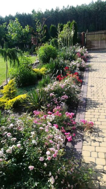 Róże rosną u mnie wszędzie, dodatkowo wyścieliłam rabaty szyszkami, co w cale im nie przeszkadza, a wręcz podkreśla ich urok. Uwielbiam róże, wychodzę z założenia, że róż nigdy nie za dużo. Uwielbiam róże okrywowe, większe typu Antique, Louise oDier, Pomponella, a także mniejsze jak Heidi Klumm.