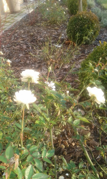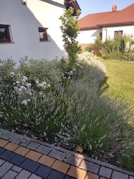 W 2017 r., przy tarasie powstała „biała” rabata, na której pierwsze skrzypce miała grać róża miniaturowa White Fairy. Posadziłam 6 sztuk tej odmiany w towarzystwie białej lawendy, formowanych bukszpanów, tłem z derenia Ivory Halo. Wiosną rabatę zdobią białe tulipany i magnolia gwieździsta. W tym roku jednak biała lawenda prawie „pochłonęła” różę 😉 Odmiana ta świetnie daje sobie radę na Mazurach bez żadnych dodatkowych zabiegów przed zimą (także bez kopczykowania), a w 2017 r. kwitła nawet 28 grudnia!