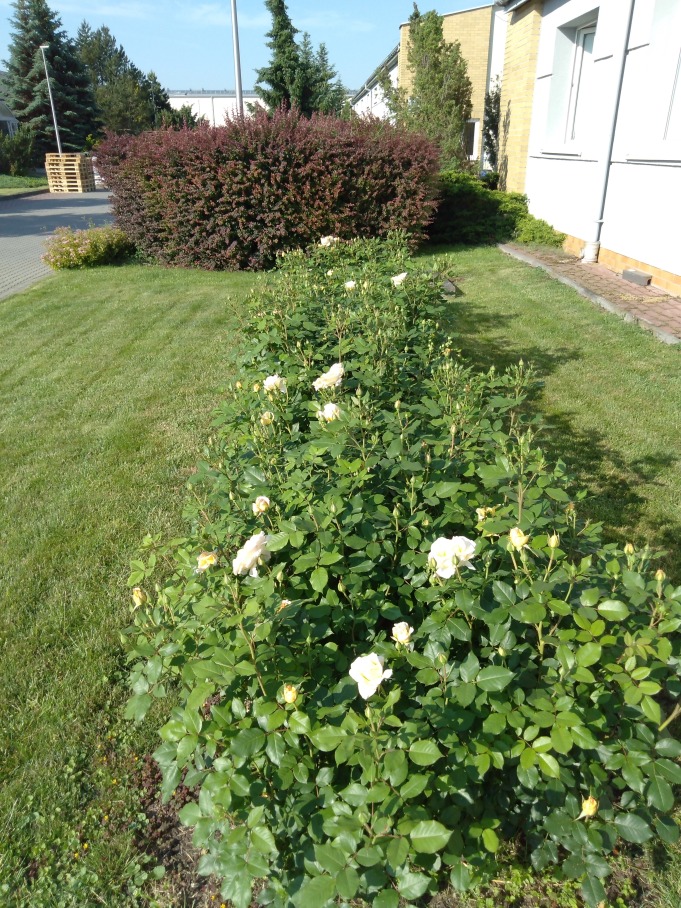 Druga rabata, to odmiana “Arthur Bell” (zdjęcia 2-a,b,c,d,e,f) , krzewy sadziłem 6 lat temu, aby “wypełnić i uatrakcyjnić” dość duży trawnik znajdujący się w części technicznej fabryki. Odmiana ta bardzo pozytywnie mnie zaskakuje, jest pachnąca, bardzo długo utrzymuje zielone i błyszczące liście, a przy intensywnym usuwaniu przekwitniętych kwiatów, kwitnie nawet w listopadzie. Wada – jest bardzo “kolczasta”, przez co jej cięcie wiosenne nie należy do przyjemnych.