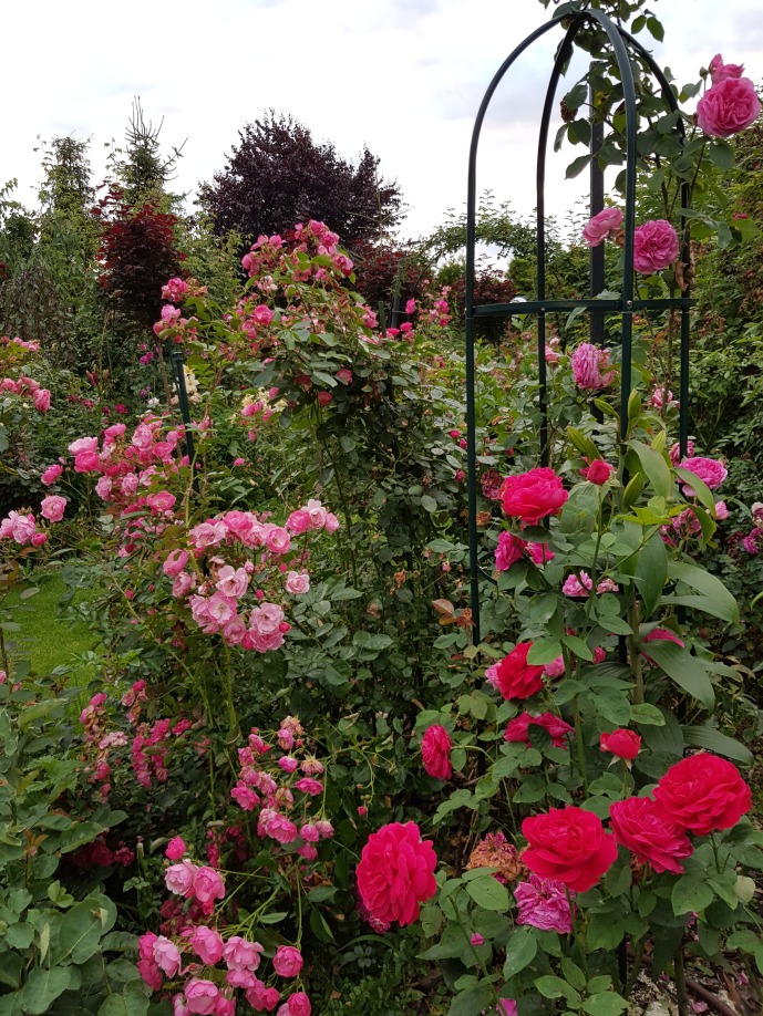 Pergolki, trejaże i zwykłe podpory wszystko dla róż. Mój ogród jest wypełniony krzewami różanymi, mam ramblery rosnące do nieba, róże krzaczaste, rabatowe parkowe i pienne. W lutym tego roku podjęłam wyzwanie zliczenia wszystkich krzewów różanych dokładnie znacząc liczone krzewy, mam ich ponad 1800szt. Obszar mojego ogrodu to 3000m2 więc było gdzie sadzić. Jestem amatorką, nie znam nazw tych wszystkich róż, a wiatr zabrał karteczki.