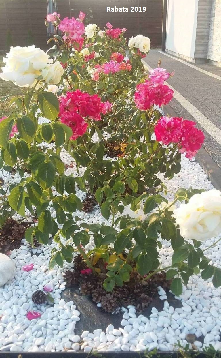 Byliśmy ciekawi jak to będzie wyglądać wiosną pomimo naszych potyczek. Gdy nadeszła upragniona wiosna o dziwo wszystkie róże się przyjęły. Bardzo pozytywnie zaskoczeni że już w pierwszym roku uprawy tak pięknie zakwitły. Nasza rabata co kilka dni przybierała nowego uroku, ponieważ gdy przekwitały pąki urywałam je. Następne zaczynały wtedy zakwitać. Żeby upiększyć podłoże zakupiliśmy białe kamyczki i obsypaliśmy rabatkę (pod różami zostawiliśmy puste miejsca żeby korzenie mogły oddychać). Podlewane były gnojówką z pokrzyw rozcieńczoną wodą. W pierwszym roku nie było zmartwień żadnych mszyc, czarnej plamistości. Drugi rok był już dla róż mniej łaskawy -mszyce, czarna plamistość, mączniak. Na początku pomagały preparaty nie chemiczne przemiennie (wywar z cebuli, czosnku, soda oczyszczona, woda i mleko) Im bliżej jesieni już były psikane kompleksową ochrona 2w1.Pomimo tych chorób róże się pięknie rozrosły. Stwierdziliśmy że białe kamyczki już tak nie pasują i je zdjęliśmy. Rozrosły się do tego tak potężnie że zaplanowaliśmy na następny rok zrobimy im podporę. Po ścięciu na jesień (mając na uwadze główne ciecie na wiosnę)i poobrywaniu liści były psikane kompleksową ochrona żeby zapobiec wiosną czarnej plamistości.