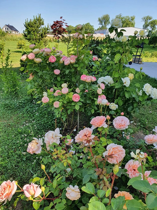 Na zdjęciu gatunki róż : Candy Rain, English Garden, Auswalker, Auscat biała, Chopin, Leonardo da Vinci, Lovely Rokoko