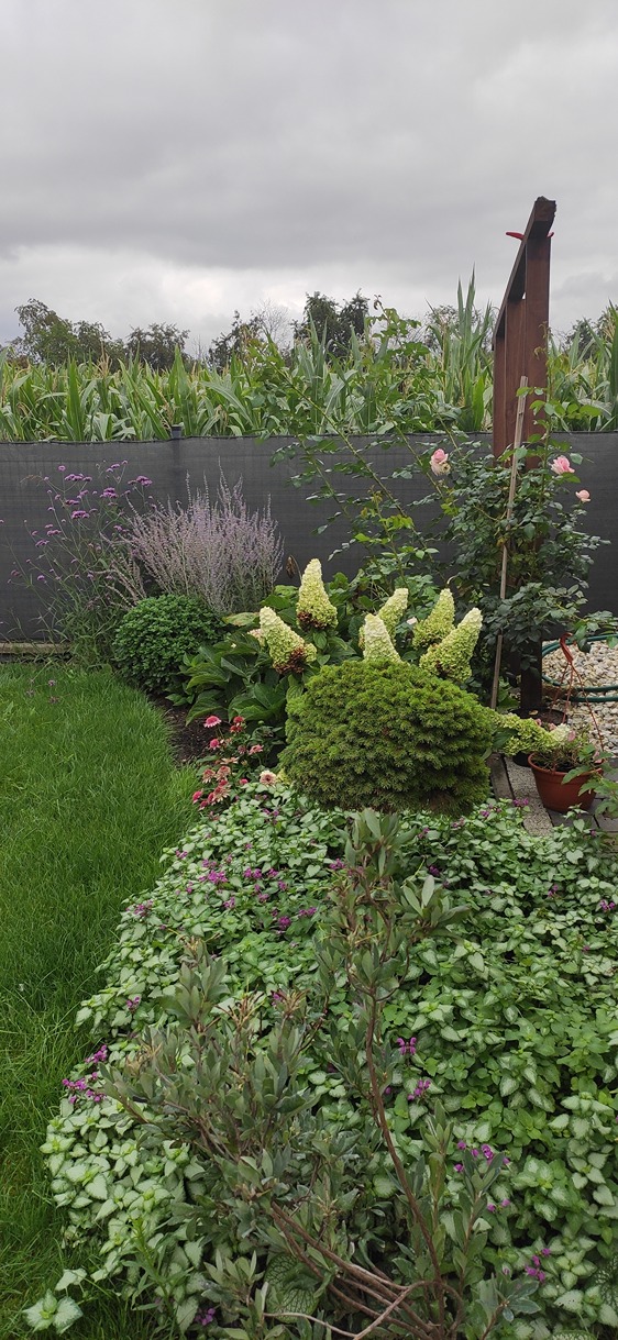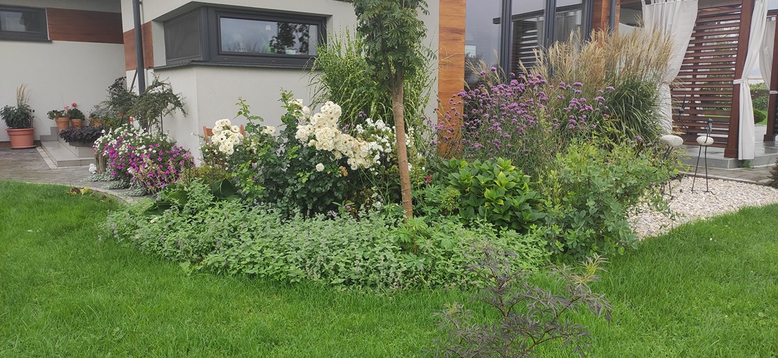 tworzę swój ogród już dwa lata; poniżej aktualne zdjęcia moich rabatek, oczywiście róże obowiązkowo muszą być. Kompozycja w okręgu z różą Playfull rokoko za nią w tyle i bliżej na drugim zdjęciu niezawodny Sirius, za ptakami posadzone wiosna nieśmiało wychylają się spod traw róże krzaczaste David Austin i jeszcze na ostatnim pięknie rozrasta się Giardina.