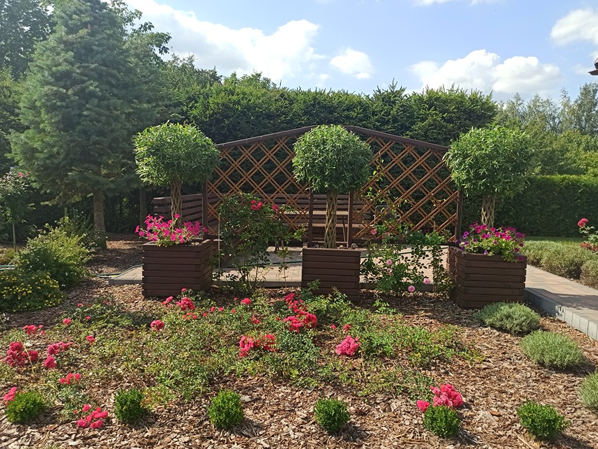 Przesyłam zdjęcia rabaty, która powstała na wiosnę 2023 roku, więc rosną na niej bardzo młode różne kupione w marcu bieżącego roku z gołym korzeniem. To honorowe miejsce na działce, na które mamy widok z tarasu oraz z okien salonu, kuchni i sypialni. Pierwsze zdjęcie zostało zrobione 1 lipca 2023r., gdy róże były w pełni pierwszego kwitnienia. Drewniane donice i kratki, po których będą się pięły róże pnące wykonał mój mąż. Do donic wsadziliśmy dwuletnie wierzby plecione. Pomiędzy donicami rosną róże pnące: z lewej strony róża pnąca Laguna, z prawej strony róża pnąca John Davis.