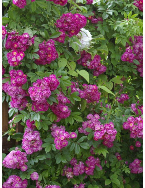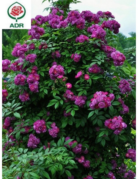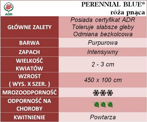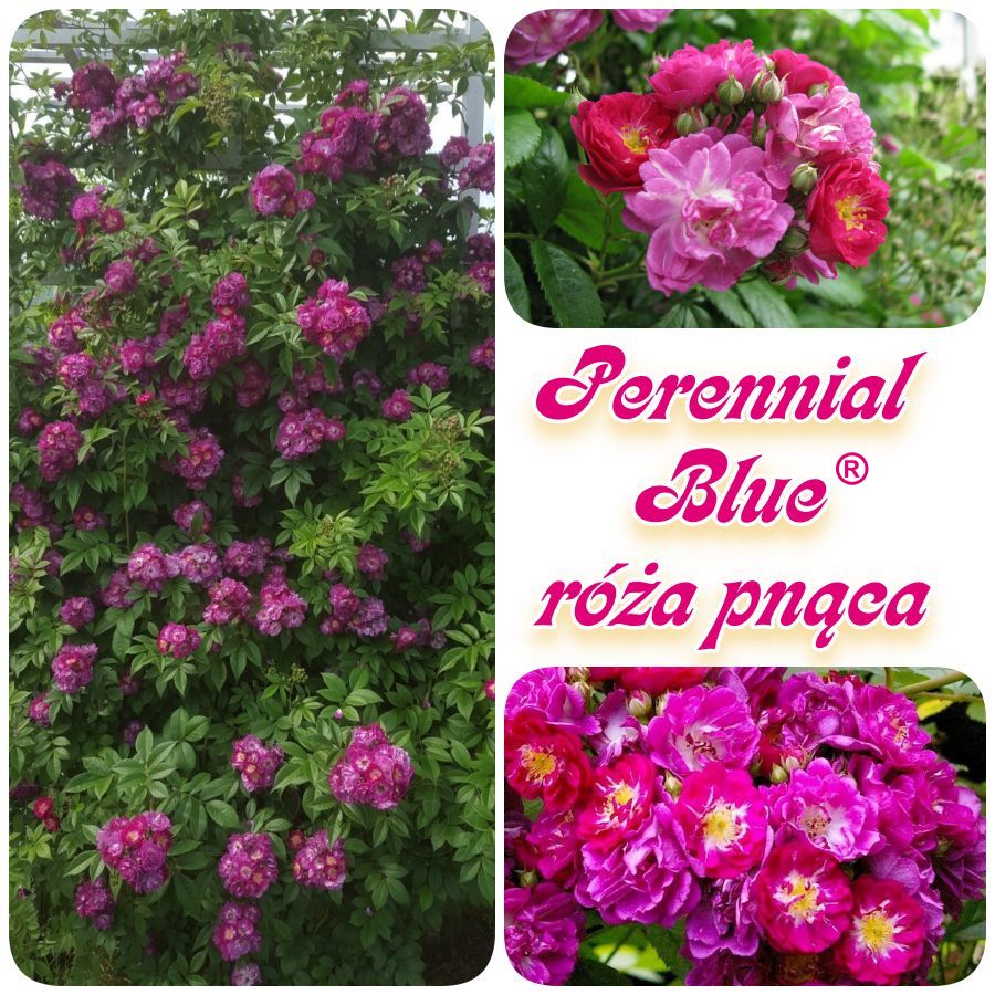 To odmiana, która do ogrodu wprowadzi mnóstwo romantycznego uroku. Wszystko za sprawą swoich maleńkich, półpełnych kwiatuszków ulokowanych na pędach w ogromnych wiechach. Kwiaty złożone z około 15 płatków w odcieniu głębokiej purpury, przechodzą z czasem w subtelny fiolet i róż, tworząc efektowne kaskady barw. Chętnie ukazuje pręciki, dzięki czemu swoich wielbicieli znajduje również w owadach miododajnych. Aromatem zdecydowanie wyróżnia się na tle innych róż pnących - dość mocny, trwały, słodki zapach wyczuwa się z daleka. Zakwita jako jedna z pierwszych, wnosząc lekkość do ogrodowej przestrzeni. Elastyczne, smukłe pędy, gęsto pokryte listkami to doskonałe tło dla jej spektakularnego kwitnienia. Świetnie wspina się po podporach, oplatając pergole, kratki, bądź łuki. Doskonałą zaletą są rzadko ulokowane, maleńkie kolce - pielęgnacja jej to czysta przyjemność. Potrafi osiągnąć ponad 400 cm wysokości. Listowie ciemnozielone o pięknej teksturze. Róża pnąca Perennial Blue jest nie tylko piękna, ale także niezłomna. Odporna na kaprysy pogody i mrozy. Otrzymała certyfikat ADR, który potwierdza jej niesamowitą odporność również na choroby grzybowe. Toleruje stanowiska słoneczne jak i półcieniste. Ponadto dobrze znosi słabsze gleby. To różyczka dla tych, którzy pragną w swoim ogrodzie odrobiny uroku, zamkniętej w kaskadach purpurowych płatków.
