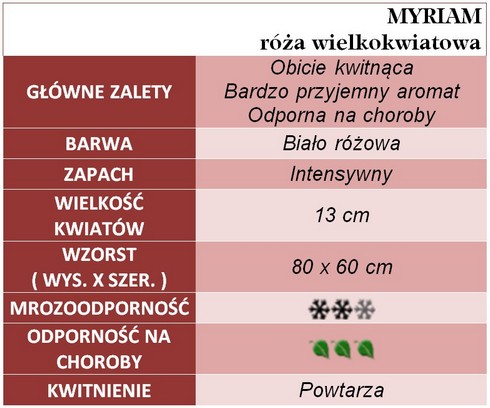 Miriam ma piękne delikatnie różowe kwiaty, kwitną cudnie, przesyłka dotarła nie naruszona profesjonalnie zapakowana, różyczki z mocnym systemem korzeniowym, polecam szkółkę, z którą zaczęłam swoja przygodę z różyczkami i będę wracać, gdyż rośliny są dorodne i w porównaniu z innymi ofertami tańsze, godne polecenia.