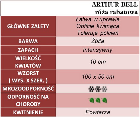 Opinia Pana Leonarda: "Odmiana róży rabatowej "Arthur Bell" krzewy sadziłem 6 lat temu, aby "wypełnić i uatrakcyjnić" dość duży trawnik znajdujący się w tej części technicznej fabryki. Odmiana ta bardzo pozytywnie mnie zaskakuje, jest pachnąca, bardzo długo utrzymuje zielone i błyszczące liście, a przy intensywnym usuwaniu przekwitniętych kwiatów, kwitnie nawet w listopadzie. Wada - jest bardzo "kolczasta", przez co jej cięcie wiosenne nie należy do przyjemnych."